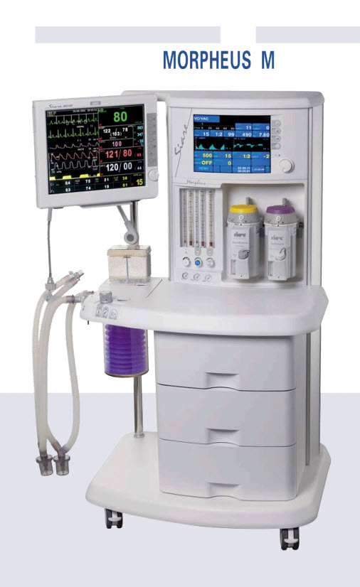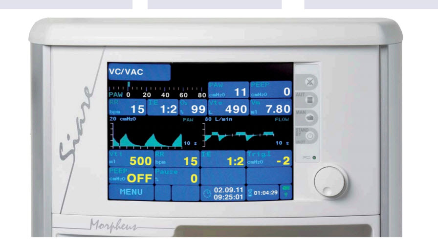 The lung ventilator incorporates a 12" TFT high resolution colour display with membrane keyboard and encoder.